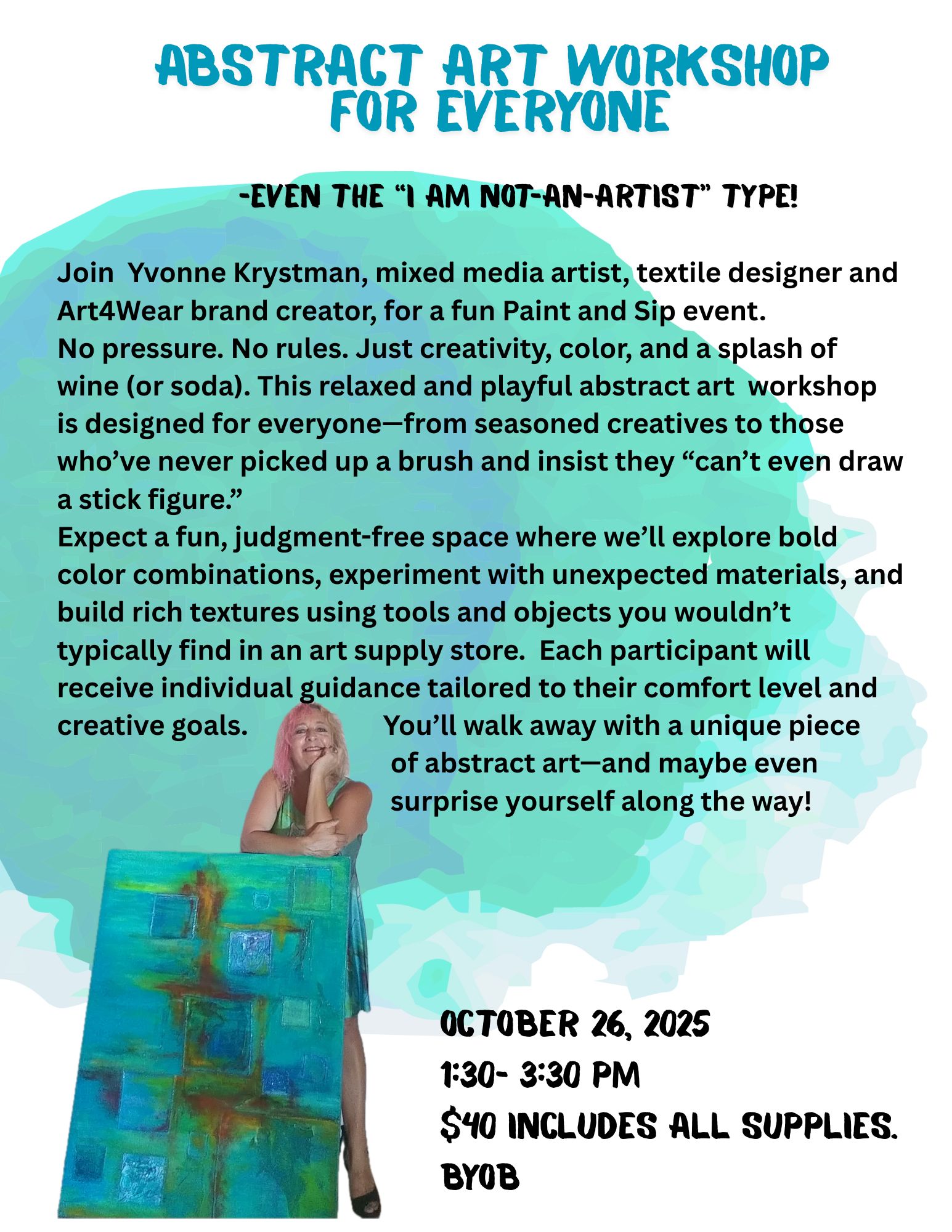 This is a relaxed, no-pressure art class made just for adults who want to have fun, get creative, and try something new—no experience needed! We’ll be making colorful, abstract mixed-media art on canvas using paint, fabric scraps, string, and other fun materials to build texture and personality into each piece.